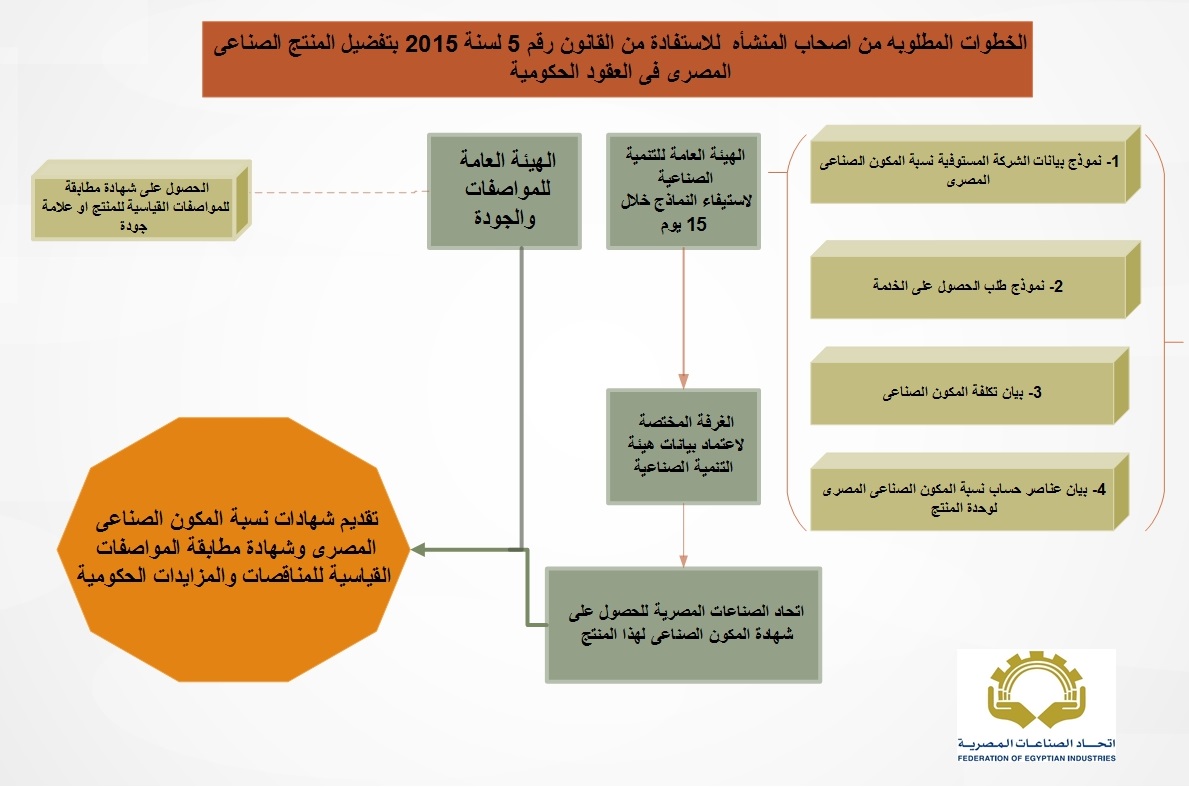 سعى اتحاد الصناعات المصرية كثيراً لتفضيل المنتجات الصناعية المصرية فى العقود الحكومية حرصاً منه على صالح الصناعة المصرية وتشغيل المصانع بطاقاتها الإنتاجية، حتى صدر القانون رقم (5) لسنة 2015 بشأن تفضيل المنتجات المصرية فى العقود الحكومية، وأصبح الوزير المختص بتنفيذ هذا القانون هو الوزير المعني بشئون الصناعة.